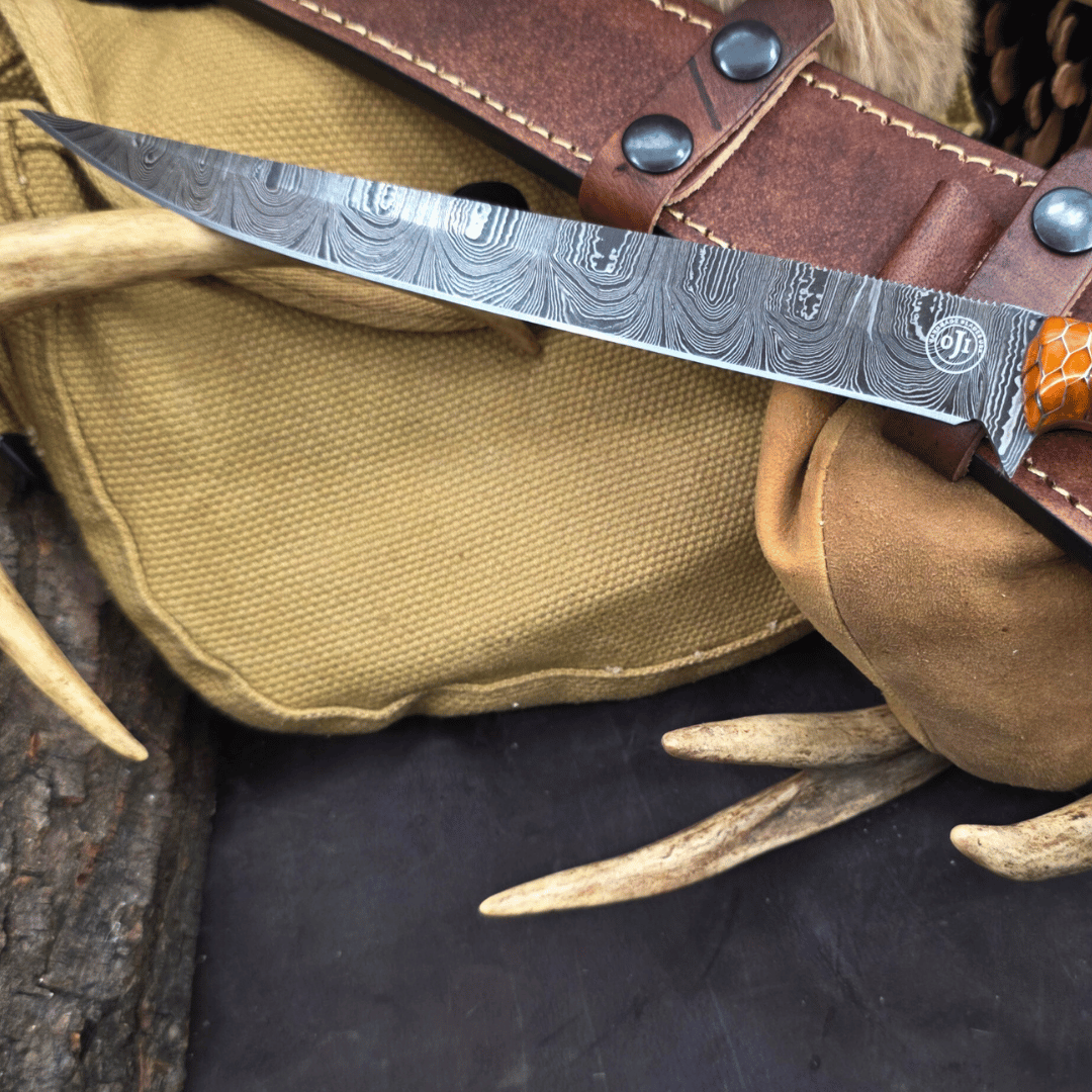Damascus Fillet Knife Orange Honey Comb Handle Leather Sheath