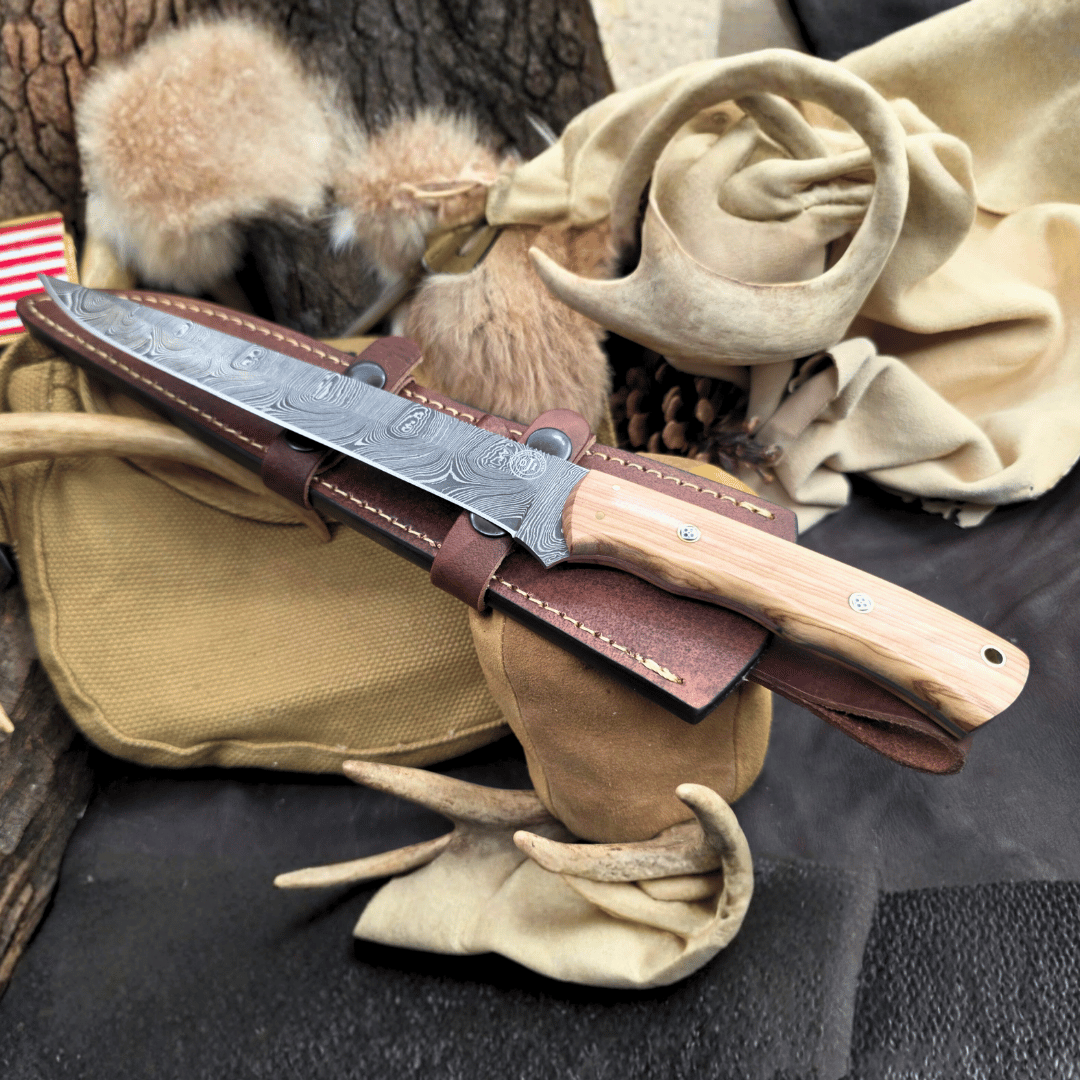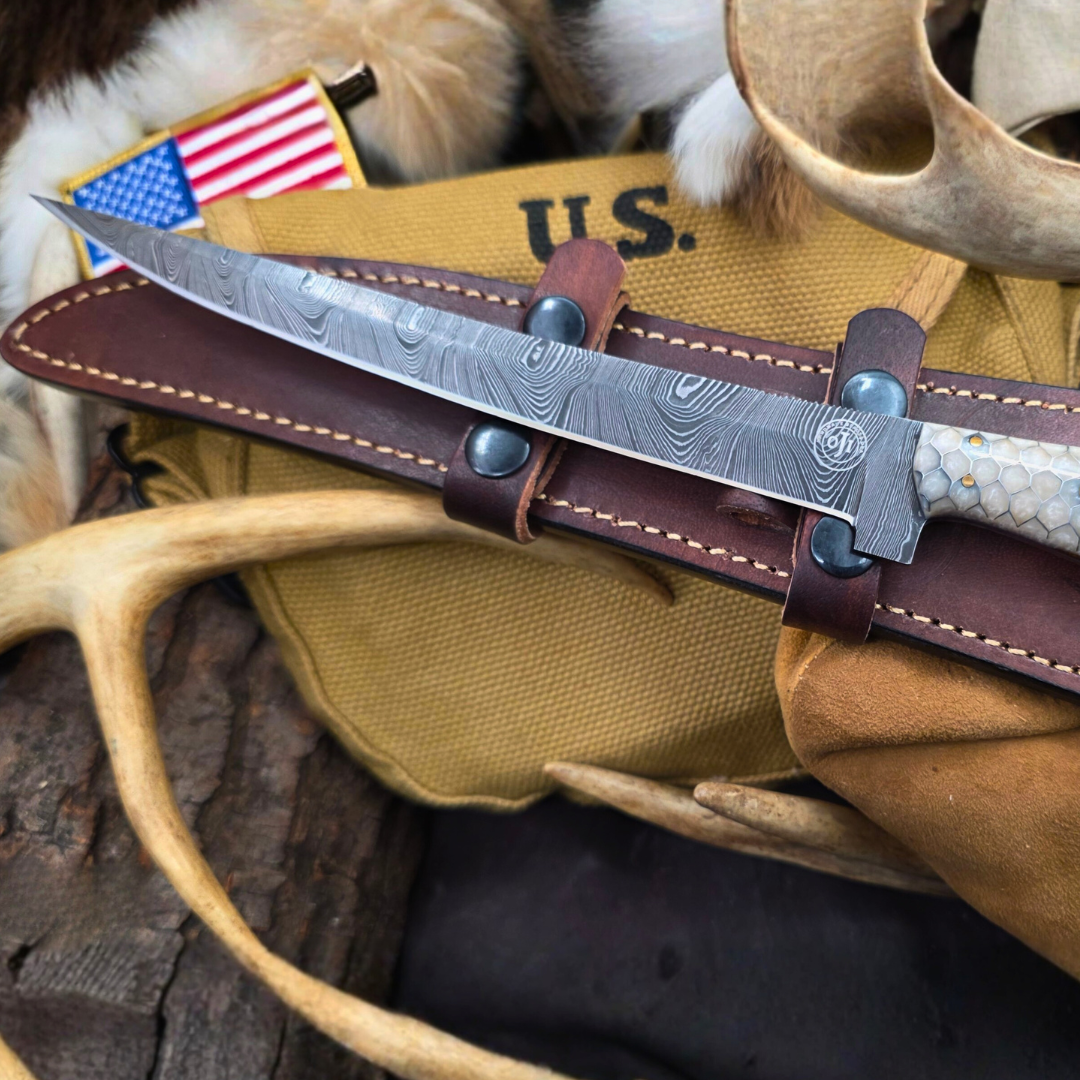 Damascus Fillet Knife Wood Handle Cowhide Leather Sheath