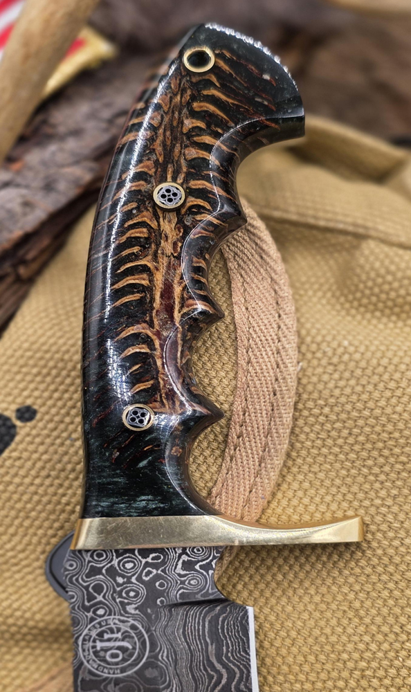 Damascus Steel Bowie Handmade Skinner Knife: Brass Guard Green Pinecone Handle, Leather Sheath