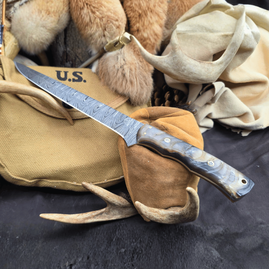 Damascus Fillet Knife Himalayan Sheep Horn Handle Cowhide Sheath