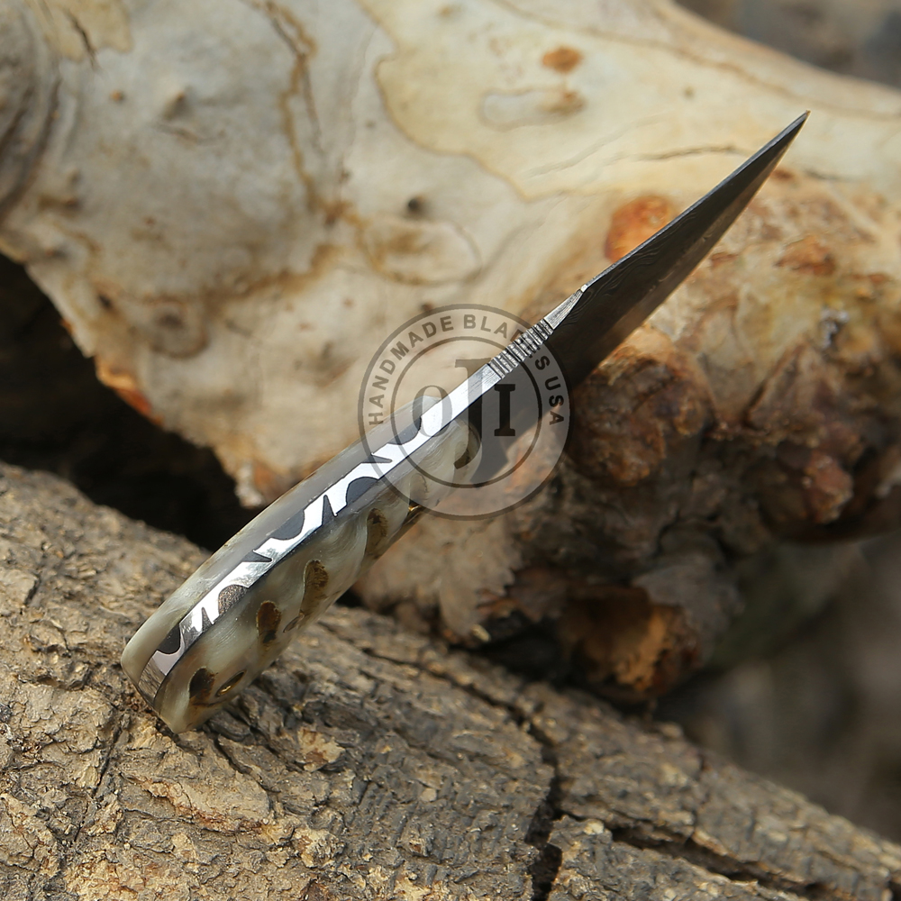 Damascus EDC MINNI Skinner Knife Himalayan Sheep Horn Handle