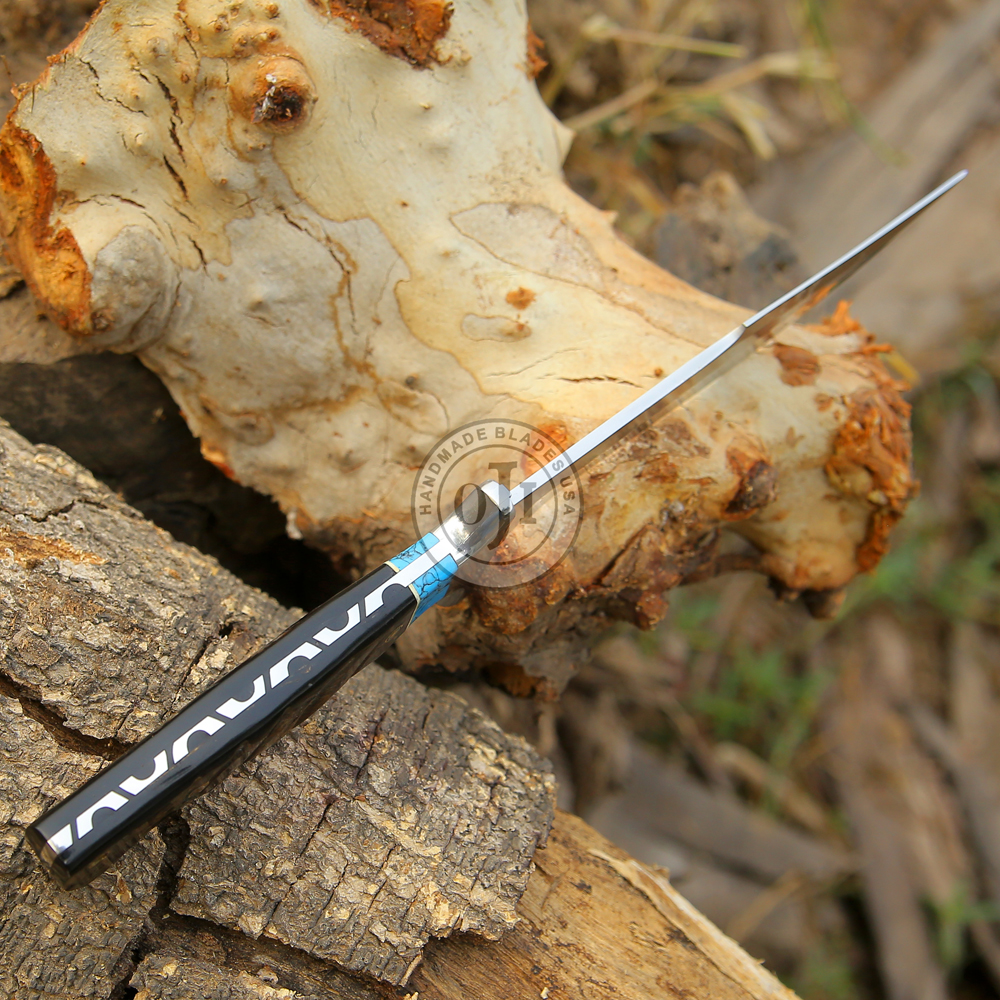 Big Bowie DC53 Steel Handmade Hunting Camping Knife: Turquoise & Black Horn Handle, Leather Sheath